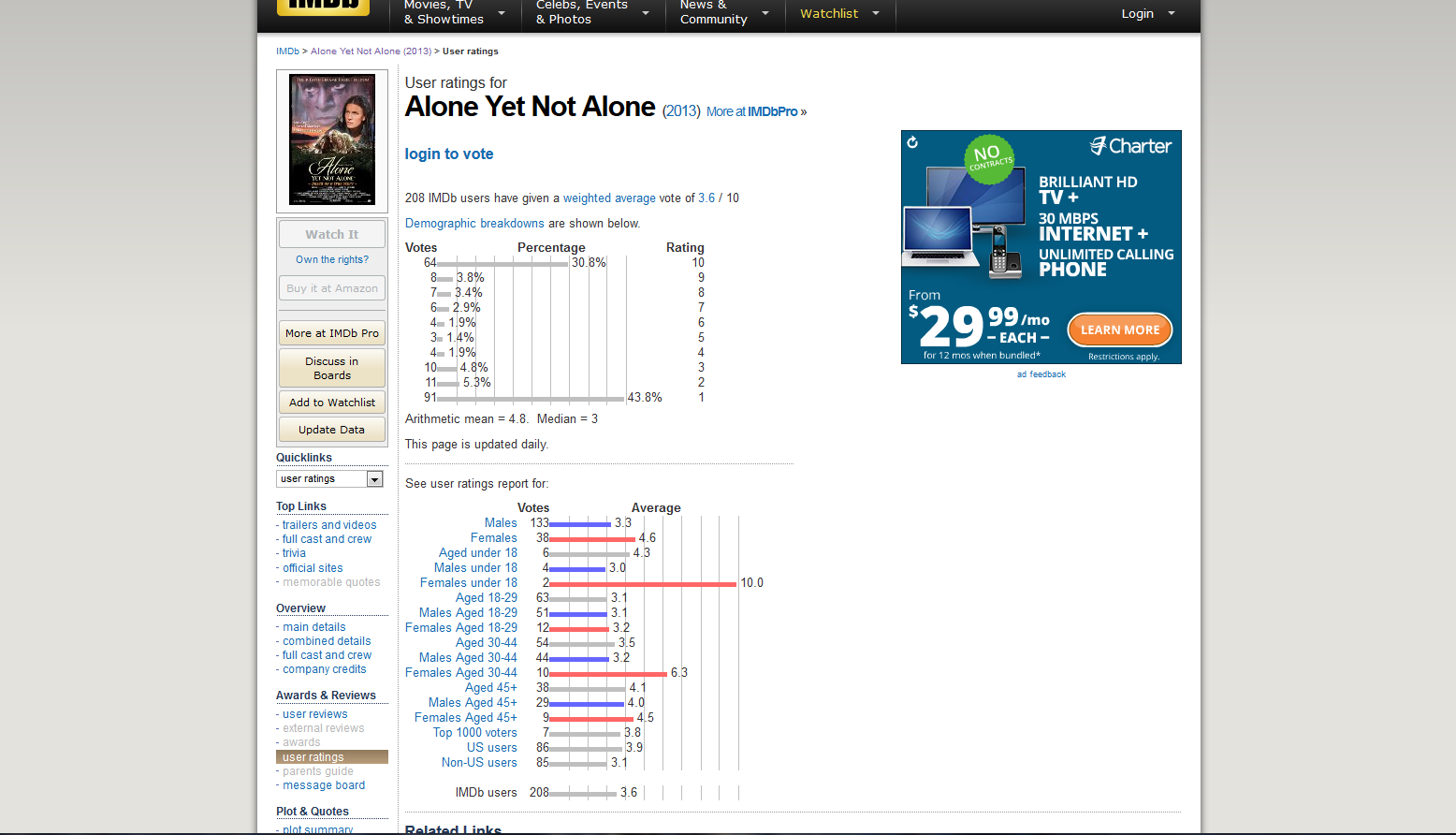 It's a shame that the mistakes of the songwriter resulted in the singer not getting her fair chance in the spotlight. But regardless, the Oscar snub is not why I'm making this post; the rules were apparently broken (whether accidental or not) and I'm not going to complain about it. I'm making this post because of the supposed "ratings" for the movie that appear at the IMDb. At the time of this post, the movie has an average 3.6/10 rating from a total of 208 voters. What's most intriguing is the details of those statistics. I've attached a screenshot of the rating details.